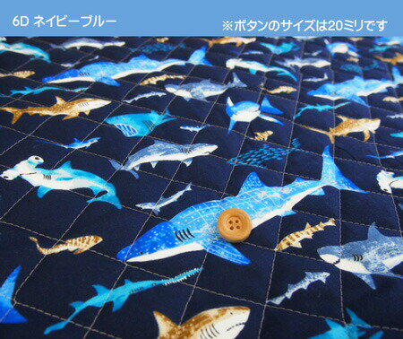 <<キッズプリントシリーズ>> たくさんの種類のサメがプリントされているキルト生地です。