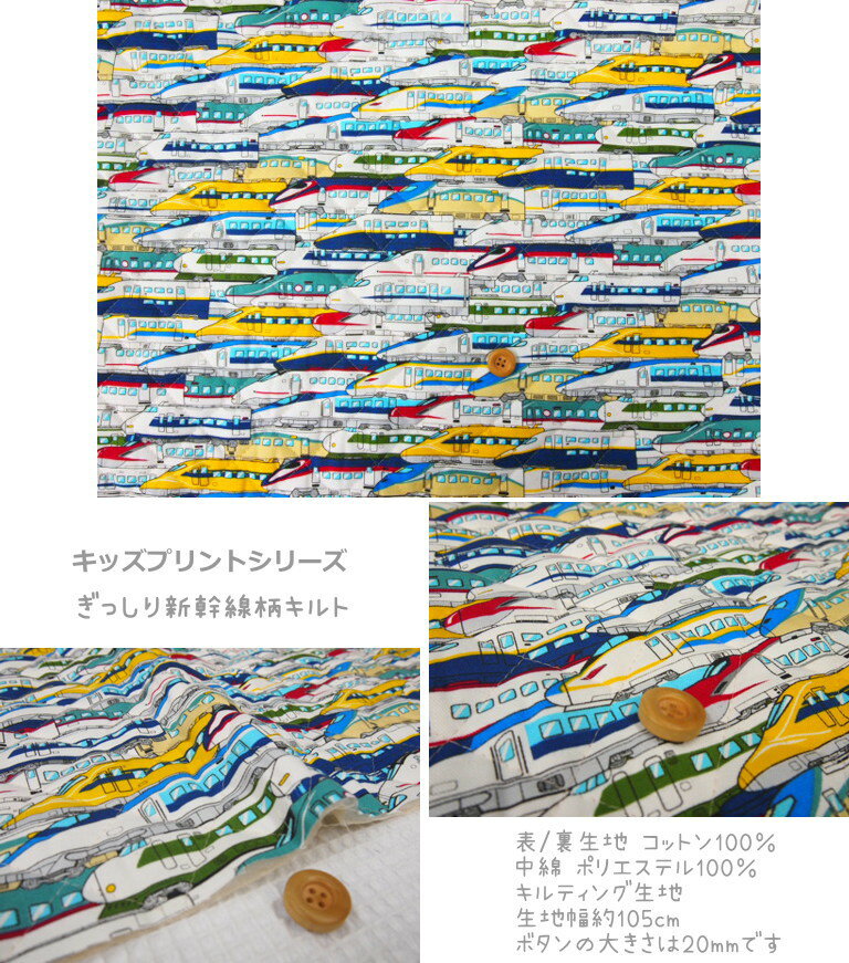 <<キッズプリントシリーズ>> ぎっしり新幹線柄キルト生地 いろいろな種類の新幹線をぎっしり詰め込んだかっこいいプリントです。